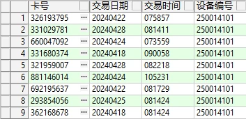 假设,现在有一张卡交易表(表名:card_table),这张表有卡号、交易日期、交易时间、设备编号4个字段,如下图。