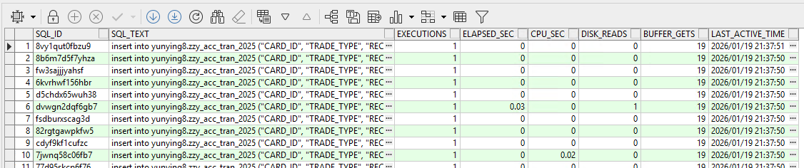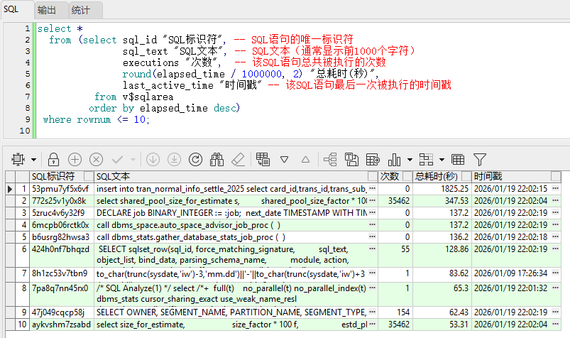 说明:v$sqlarea存储共享池中缓存的SQL执行统计,实例重启或SQL被淘汰后数据会丢失,适合查看近期(几小时到几天内)执行的SQL语句。