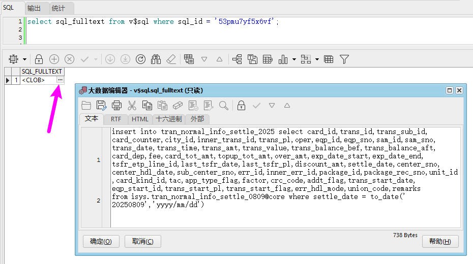 另外,我们还可以根据 SQL_ID 查看完整的 SQL 语句信息: